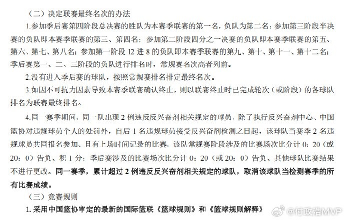 CBA新赛季的具体规定如下:同一赛季期间,同一队出现 2 例违反反兴奋剂相关规定的球员,除了执行反兴奋剂中心、中国篮协对违规球员个人的处罚外,自后 1 名违规球员接受反兴奋剂检测之日起,该球队当赛季 2 名违规球员共同报名参加、且有上场时间记录的比赛,该队常规赛阶段涉及的比赛场次比分计 0:20(或20:0)告负、积 1 分;季后赛涉及的比赛场次比分计 0:20(或 20:0)告负、其他球队比赛结果不进行更改。同一赛季,累计超过 2 例违反反兴奋剂相关规定的球队,取消该球队当检测赛季的所有比赛成绩。
